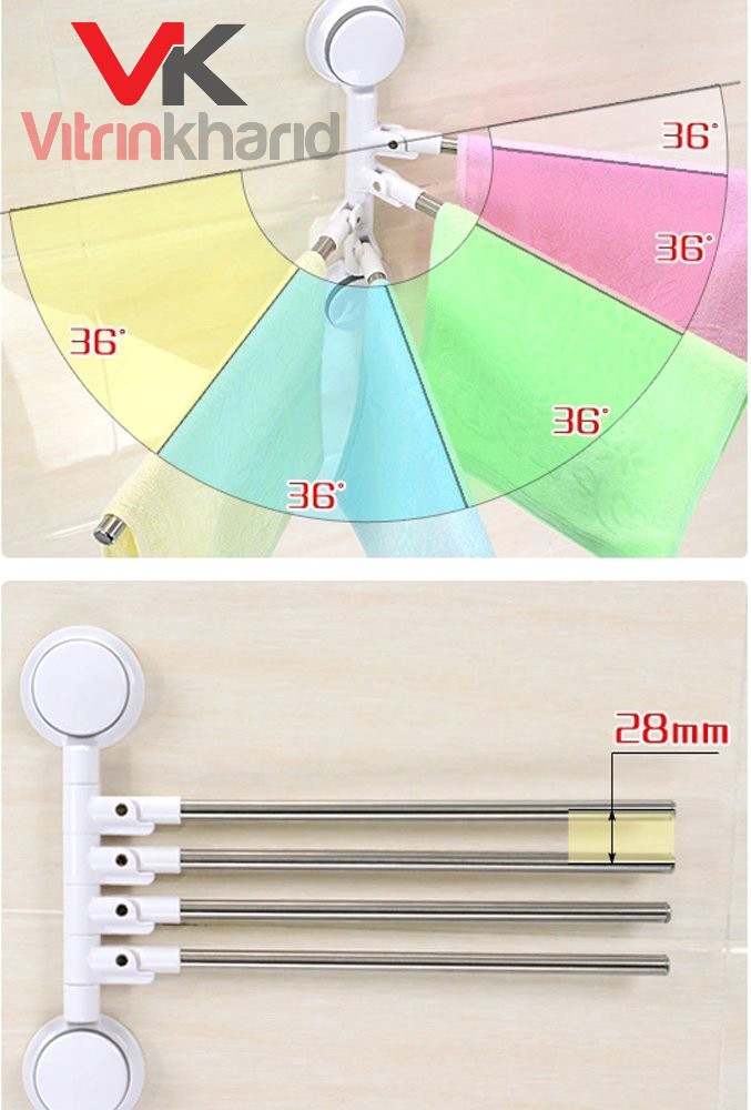 وجود حوله های متعدد در خانه خصوصا در حمام و نبود جای کافی برای آویزان کردن آنها باعث می شود که با مشکل خشک نشدن و گاهی اوقات بو گرفتن حوله ها مواحه بشوید. جای حوله ای دیواری چرخشی (4 میله ای) یک وسیله مناسب برای قرار دادن چند حوله به صورت مجزا است که قابل نصب بر روی دیوار می باشد. این محصول 4 عدد میله ..... سانتی متری دارد که قابلیت چرخش دارند تا از افتادن حوله های خیس و مرطوب بروی هم جلو گیری می کند.ابعاد این وسیله کم جا ...... سانتی متر است و بدون سوراخ کردن دیوار و با استفاده از بادکش به سطوح صاف و با چسب سیلیکونی به سطوح غیر صاف می چسبد. جنس میله های این حوله آویز دیواری چرخشی ضد زنگ است و مناسب برای استفاده در جاهای مرطوب می باشد. میله های این محصول با استفاده از مفصل قابلیت دوران 180 درجه افقی را دارد. از این وسیله می توان همچنین در ادارات، هتلها، آرایشگری ها و یا هر جای دیگر استفاده کرد. مشخصات فنی و نظرات